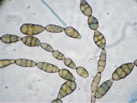 Aureobasidium, Cladosporium and Penicillium spp. The photographs below show a building wall covered with fungal growth (identified as Alternaria) sp.. The microscopic images show the development of fungal hyphae and on close-up, the pigmented spores can be seen.